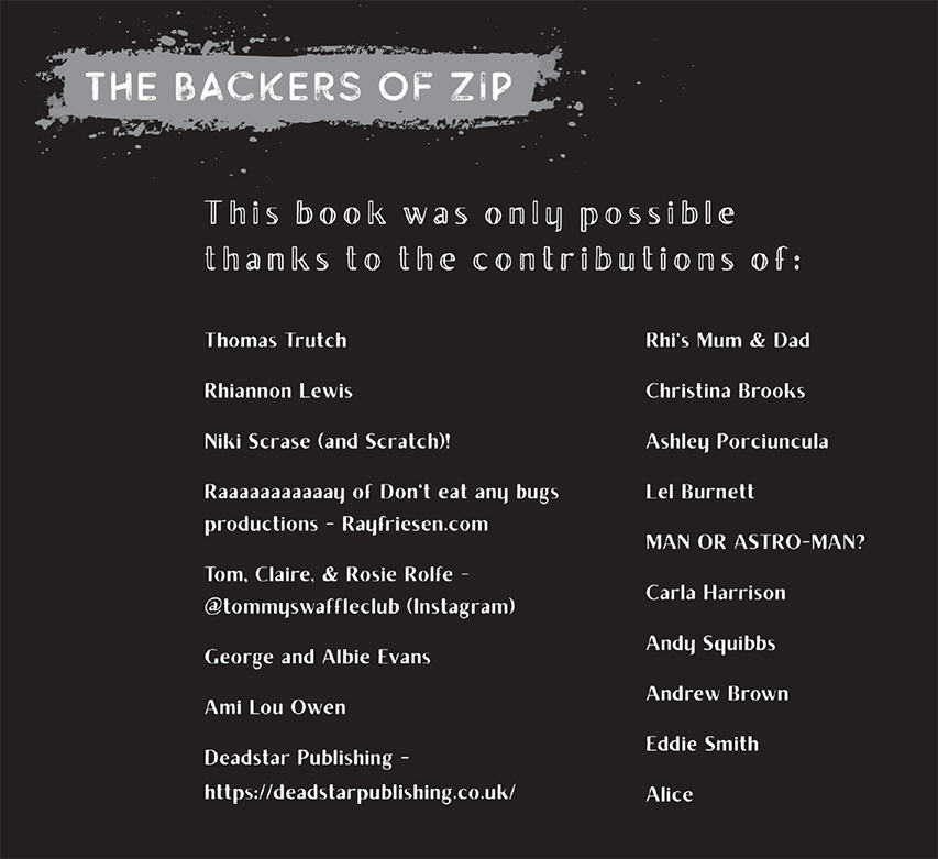 Zip is published by Markosia in the United Kingdom. © Mike Scrase 2023. ISSN 2976-8721 (print) 2976-8721 (online). No similarity between the names, characters and institutions depicted in Zip with any real life names, persons, or institutions is intended. Any such similarities are purely coincidental. Zip’s Kickstarter rewards are printed in the UK by Stuart Lloyd Gould.